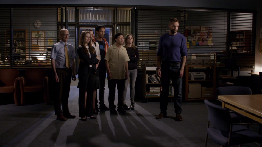 Cuando se entera de la noticia de Annie, la que más le afecta a nivel emocional (y eso que vemos que la de Abed también es muy dura para él), a Jeff le posee el ambiente “meta” que se respira en la conversación y empieza a imaginarse cómo serían sus próximas temporadas. En una de ellas se ve sentado en la mesa de la biblioteca con los “inmortales” Garrett, Vicki, Todd, Leonard y un nuevo jefe rico, Scruch (cameo de Seth Green) en el llamado “Comité Eterno de Greendale”. Pero en seguida se da cuenta de que no quiere un futuro sin Annie y se inventa una trama policial (a costa del asesinato de los padres de Britta) para que vuelva a investigar a Greendale como agente del FBI.
