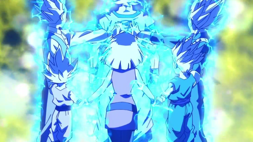 Vegeta, Gohan, Trunks y Goten, los únicos saiyans conocidos, cogen sus manos y transmiten su poder a Goku, el cual servirá como recipiente para convertirse en el Super Saiyajin Dios.