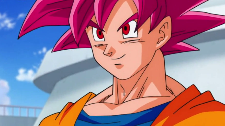 Finalmente, la luz azul cesa de brillar y el aura de Goku se convierte en color rojo intenso. Todo vuelve a la calma salvo Goku. Éste presenta un nuevo aspecto. ¿El aspecto de un Dios? Dende nos lo confirma (entre Dioses se captan sus energías). La nueva apariencia de Goku le otorga un aspecto más ligero, más joven (como confirma su mujer) y su gran cambio llega en la cabeza: ojos rojos y pelo rosáceo. Ha nacido un Dios. El Super Saiyajin Dios.