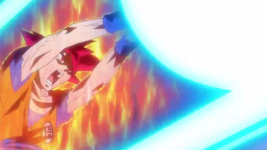 Con todo el poder de su nueva transformación, Goku crea un Kame Hame Ha tan enorme y divino (perteneciente a un Dios) que convierte en cenizas todas las bolas de energía creadas por Bills. Éste queda alucinado ante tal ataque, como nunca antes lo habíamos visto.