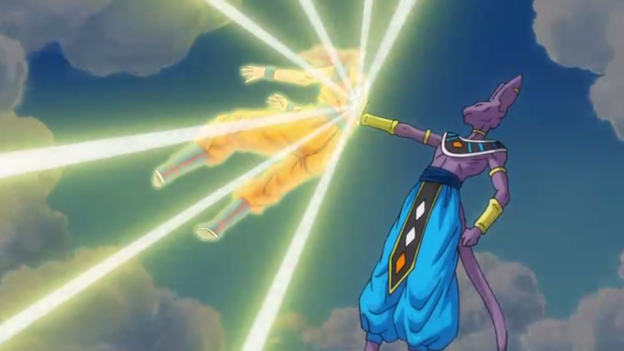 Además, Bills lo hace muy bien en cuanto al equilibrio de la batalla se refiere, ya que si se “deja ganar” muy claramente, Goku tampoco forzará su poder, por lo que también le hace sudar (literalmente) para que no se relaje. De este modo, Bills le lanza una bola de energía dorada, más grande que la del episodio anterior, que Goku aplasta con sus manos hasta dejarla en nada.