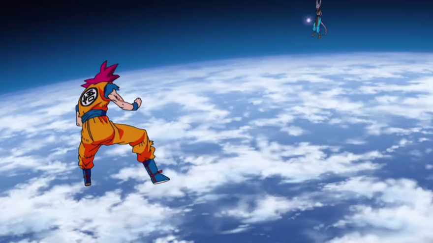 Bills asciende a Goku, en shock y sin poder mover músculo alguno, hasta el espacio exterior. Tienen sobre sus pies el planeta entero, y es que, es un combate que va más allá de lo terrenal, es un combate entre dos Dioses.