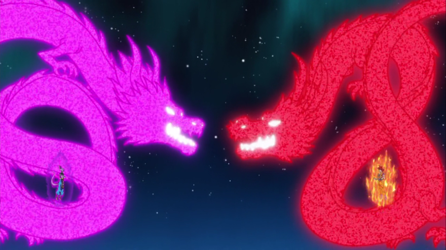 Ambos dioses continúan con el combate volviendo a extraer más y más fuerza, a ver quién es el más chulo. De sus halos de fuerza surgen dos dragones gigantes que danzan entre ellos y terminan volviendo a sus respectivos cuerpos.