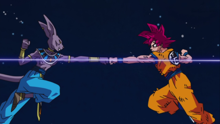 Una vez con la energía cargada, ambos dioses colisionan concentrando la fuerza del choque en un puñetazo. Este choque de trenes se nota no sólo en la Tierra sino que en todo el universo.