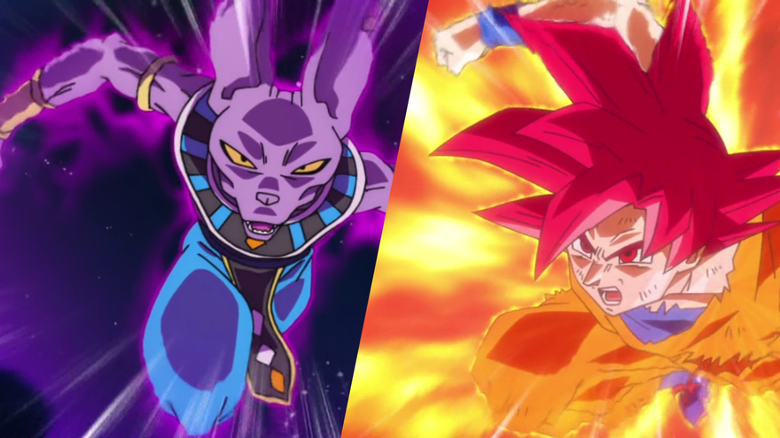 En 'Dragon Ball Super', tras haber despertado el verdadero poder del Super Saiyajin Dios gracias a su resurrección divina, Goku y Bills extraen toda su energía a relucir. Cada uno, eso sí, con sus respectivos halos de “colores corporativos” (morado vs rojo).