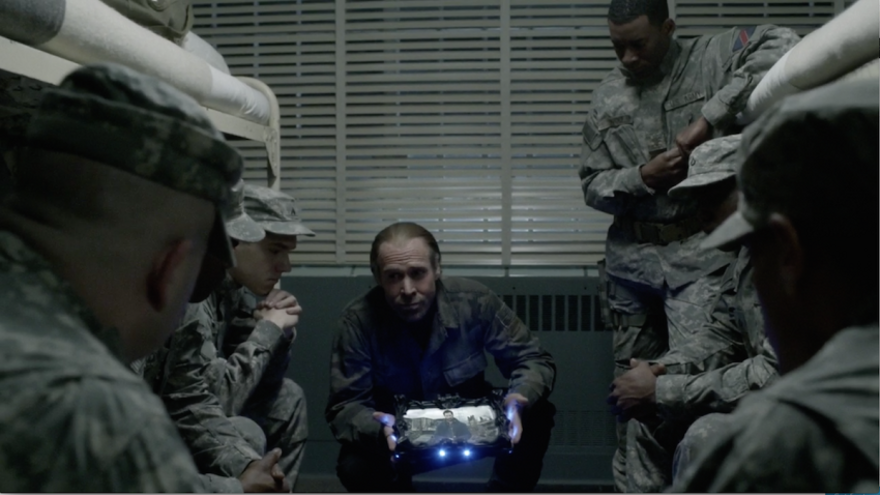 El coronel está pensativo, y un poco abatido, pese a lo que ha hecho. Ben ve el artefacto espheni ¿coño no habían caído en eso? ¡que él tiene parte espheni y se ha metido en sus cabezas! Así que lo toca a ver qué pasa. Ve los ejércitos de comandantes, acaban sacándole para que no sufra. Dice que parecía que estaban cantando, como a un ser superior ¡un alien mayor les dirige!