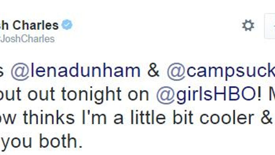 Con la excusa de que el reparto de 'The Good Wife' está aparentemente en el mismo restaurante donde ellos dos cenan, la escena, además, le sirve a 'Girls' para poder hacerle un guiño, SPOILER incluido, a esta otra gran serie, y más en particular a Will Gardner y al propio Josh Charles, en teoría también presente. Un gesto que el mismo actor no ha tardado en agradecer a Lenna Dunham y a Jenni Konner, desde su cuenta de twitter: