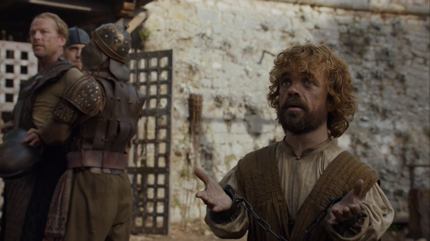 El esclavista que captura a Tyrion y Sir Jorah logra vender a este último después de hablar maravillas de él a los postores. Tyrion nos sorprende a todos salvando su vida esta vez con la fuerza física y no con la palabra, como lo lleva haciendo todos estos años. El “Gnomo” pide al comprador de Jorah que lo lleve con él también ya que son un equipo. Tyrion afirma ser un gran luchador. Todos ríen más. Éste coge sus cadenas, y en una de las escenas más surrealistas y divertidas (para el pobre esclavista no, claro) Tyrion propina una paliza al sujeto que le tiene encadenado.