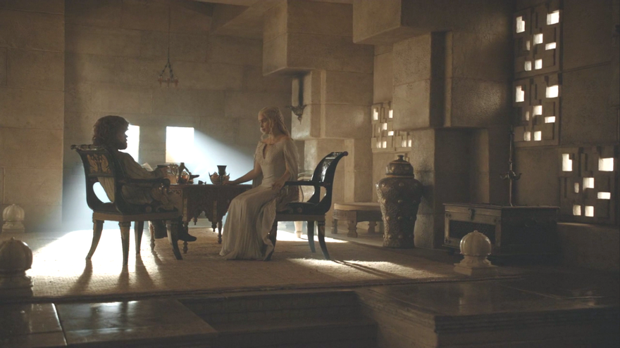 Ya a solas, Tyrion y Daenerys mantienen su primera conversación. Una de las conversaciones más esperadas, la verdad. Ver como dos personajes de tramas tan alejadas se funden en una misma, convierte a este momento en uno de los momentos más importantes de lo que llevamos de serie. Ambos se ponen al día (bebiendo vino, claro está) y se alaban mutuamente hasta que la Reina termina nombrándole su consejero. Su primer consejo: no tener por qué conquistar el Trono de Hierro debido a que ha logrado hacer una gran labor allí en la Bahía de los Esclavos.