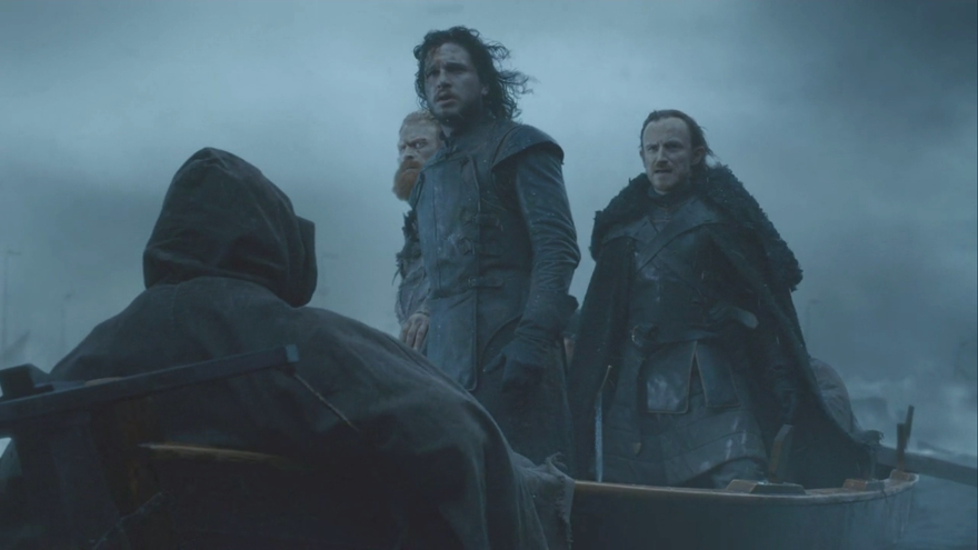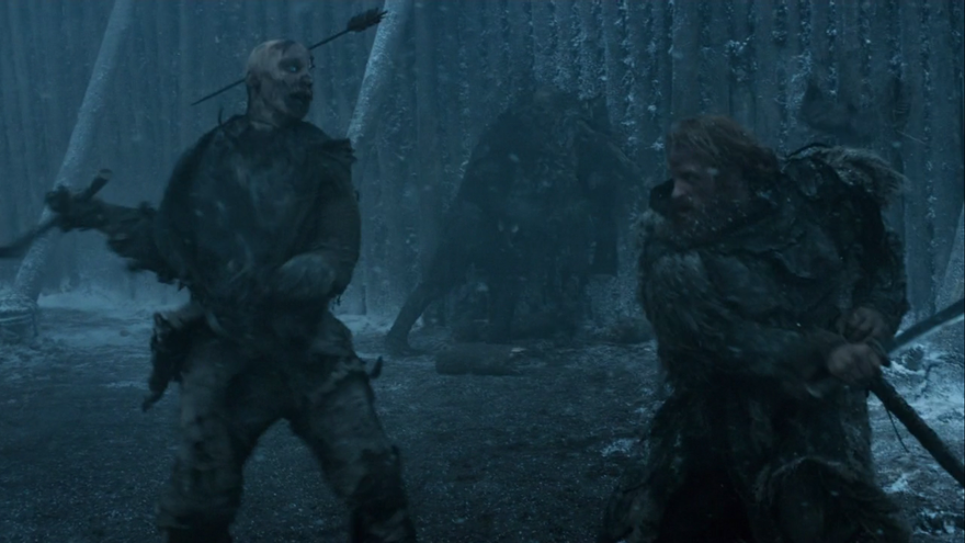 Jon, ejerciendo de líder, se queda en tierra para defender un ataque más típico de ‘The Walking Dead’ o de ‘Jasón y los argonautas’ que de la propia ‘Juego de Tronos’. A su vez, intenta recuperar el vidriagón de la cabaña, donde tiene lugar un combate cuerpo a cuerpo con uno de los jefazos de los Caminantes Blancos. Éste, se deshace pronto del líder de los thenitas gracias a su arma congeladora, sin embargo, le cuesta más deshacerse de Jon.