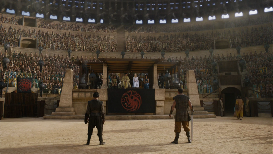 Las Arenas de Combate abren, después de tanta insistencia del prometido de Danerys, Hizdahr; nada más y nada menos que ¡en la plaza de toros de Osuna (Sevilla)! Este escenario representa el gran Coliseo (modificado en postproducción para parecer más espectacular) de Meereen donde tienen lugar los combates entre gladiadores. La Reina, mientras Hizdahr y Daario Naharis mantienen un intenso duelo dialéctico, apenas le muestra interés a los combates. No es de su agrado tanta violencia. Ni tampoco para Tyrion, el cual afirma jocosamente que “siempre ha habido suficiente muerte el mundo para mi gusto. Puedo sobrevivir sin ella en mi tiempo libre”.