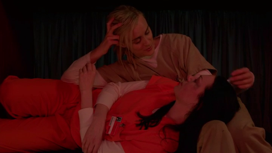 Red pasa a la cama en la que Rosa agonizó tanto tiempo, y descubrimos que Alex ha vuelto y no en buenas condiciones. Sinceramente, sé que el personaje de Alex vuelve porque la actriz se lo pensó mejor y decidió renovar como regular, pero no la eché en falta en la segunda temporada, y en mi opinión es un personaje que no beneficia a Piper más allá de la tensión sexual, ni resulta ser de las más interesantes. Pero en su vuelta, el personaje se muestra con un ojo morado y sin querer desvelar el motivo.