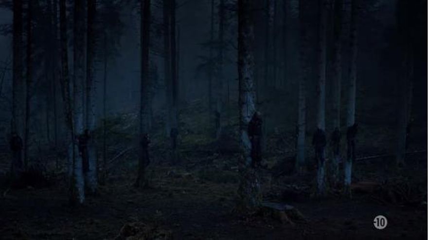 El segundo capítulo acaba con una escena chocante sobre la que se genera un cliffhanger de lo más intrigante. La policía y militares siguen en busca de la niña desaparecida. Uno de los perros policía parece tener el rastro y al seguirlo encontramos a muchos hombres muertos colgados de los árboles. Puede que sean los militares que murieron defendiendo a los que se encontraban en La mano tendida el día de la horda (último capítulo de la primera temporada).