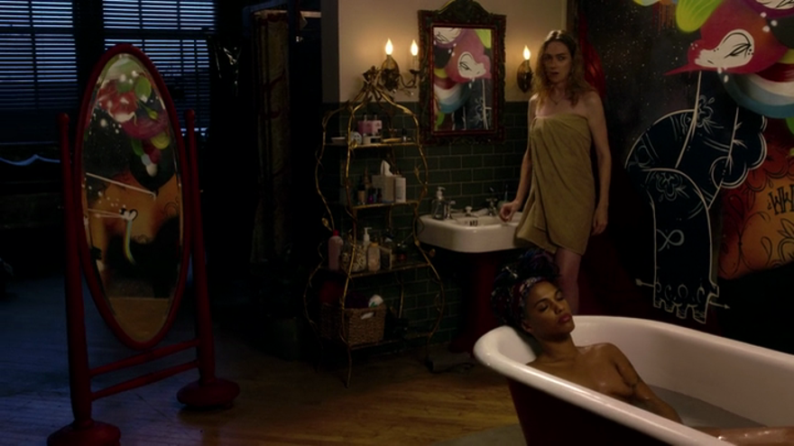 La conexión con el personaje de Daryl Hannah se da mientras van al teatro, y una de éllas la ve aparecer en el escenario.