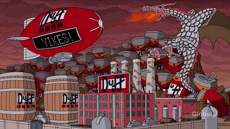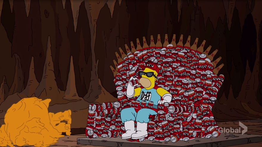 Por ello 'Los Simpsons' no iban a ser menos, caricaturizan por segunda vez (algo me dice que no será la última) este mítico opening. Esta vez lo realizan utilizando la marca de cerveza Duff, creada para la serie de animación, pero que a su vez está a la venta en el mundo real. Esta bebida es la protagonista del último episodio (26x17 Esperando a Duffman), así que se utilizan sus diferentes envases para recrear las construcciones de los Siete Reinos. En la parodia podemos ver a Homer reinar en el famoso Trono de Hierro y también realizar los juramentos necesarios para pertenecer a la Guardia de la Noche.