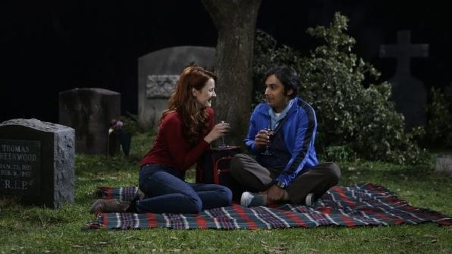 La novia de Raj, a la que llamaremos Guadiana, por que aparece y desaparece, quiere tener una cita con él en el cementerio; y Raj, que hace unas temporadas hubiese asesinado a su familia por mantener una relación sexual con una chica, decide que esa chica no es para él, pero no sabe como decírselo, incluso es la propia novia (nunca me acuerdo del nombre, perdón) la que le dice que sea valiente y le diga lo que realmente piensa. No sé que le puede deparar el futuro al personaje de Raj, pero si sigue así, podría donar una parte de sueldo para Nepal o para Haití, por que la proporción: aparición en la temporada-sueldo debe ser superior a lo que ganaba Charlie Sheen en 'Two and half man'.