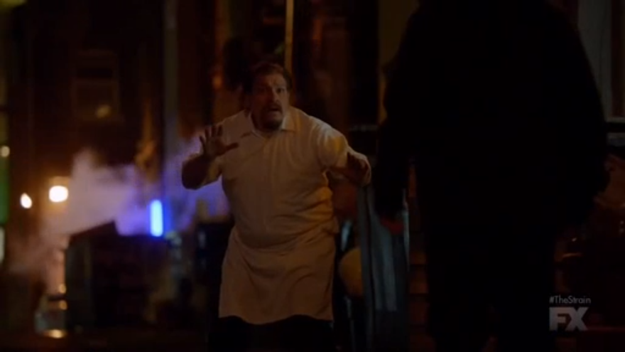 Abraham camina de noche, solo. Un strigoi le ataca por detrás y vemos una genial escena, de su cabeza decapitada moviendo la boca jaja Coge un poco de...sangre, pero parece ese otro líquido espeso blanquecino que tú y yo nos imaginamos.