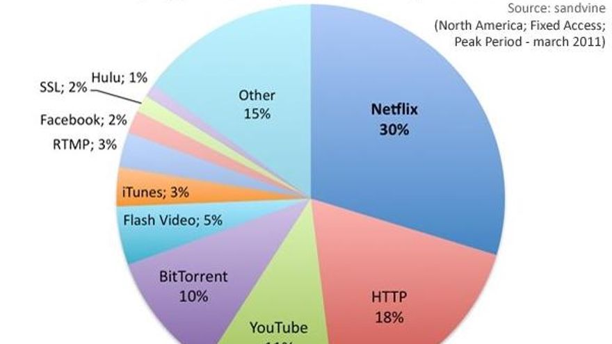 Con un 30% total de la tarta, Netflix mueve más tráfico que ningún otro servicio en USA: el triple que YouTube o BitTorrent, seis veces más que los vídeos Flash y que su competidor Hulu (el portal en el que FOX, NBC y ABC cuelgan sus series de manera gratuita para 'competir' contra Netflix).