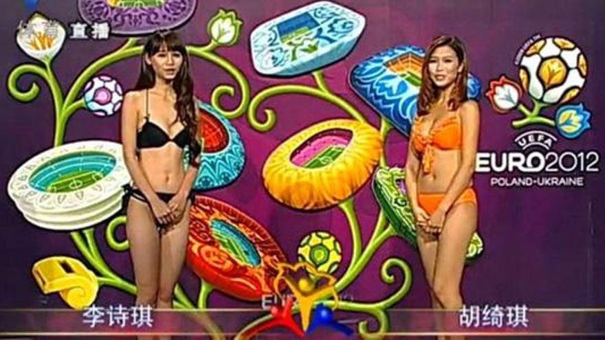 Modelos en bikini para hablar de la Eurocopa en la televisión china