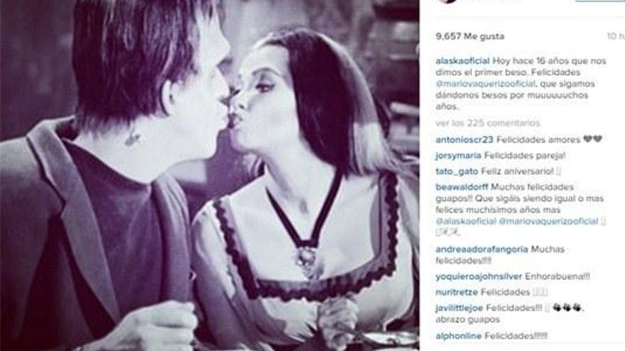 Alaska ha preferido celebrar el aniversario con un fotograma de 'La novia de Frankestein', en Instagram “Hoy hace 16 años que nos dimos el primer beso. Felicidades, que sigamos dándonos besos por muuuuuuchos años”. ¡Enhorabuena! Y que sea por los siglos de los siglos.