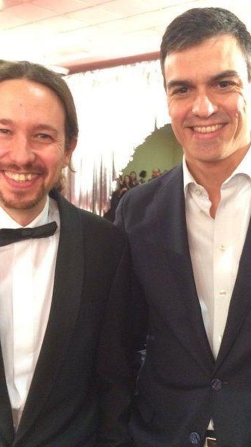 Otra de las anécdotas de la noche fue ver a Pablo Iglesias - candidato de Podemos a la presidencia- vestido de traje, algo que no había ocurrido en ningún acto político. A su lado posaba Pedro Sánchez, candidato del PSOE.