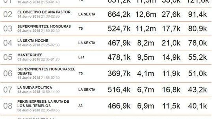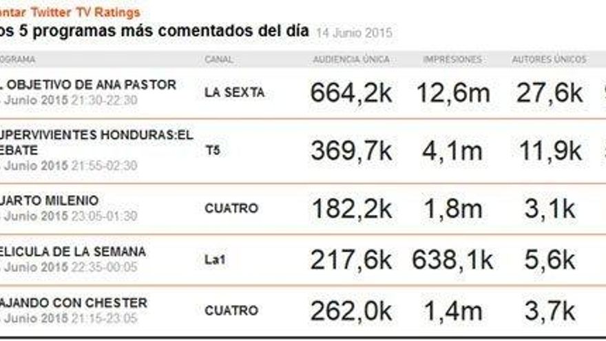 Con ese espectacular registro, 'El Objetivo' fue lo más comentado del domingo por encima de un auténtico fenómeno social como es 'Supervivientes', que es lo segundo más comentado. 'Cuarto Milenio', 'Soy leyenda' en La 1 y 'Viajando con Chester' en Cuatro cierran el top-5.
