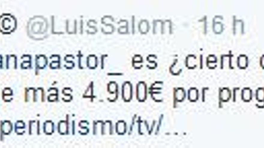 La presentadora de laSexta destacó una imagen que Salom había publicado en su cuenta personal ironizando sobre el programa de Pastor y usándolo para un montaje/crítica a Zapatero. Al tuitearlo ella, y comentar que “le pagamos todos para esto”, el trabajador del Partido Popular le echó en “cara” lo que cobraba ella en TVE, entre otras cosas.