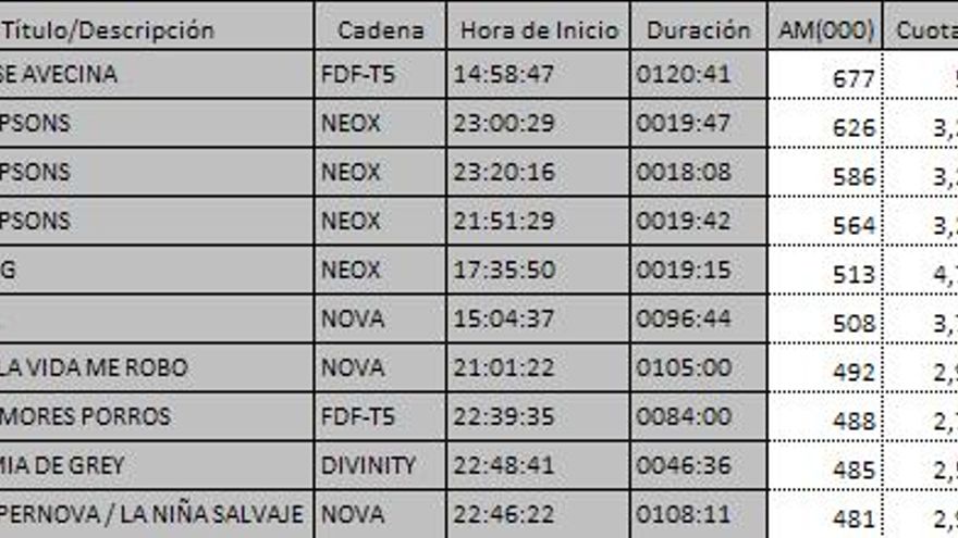LOS 10 PROGRAMAS MÁS VISTOS DEL DÍA EN TDT