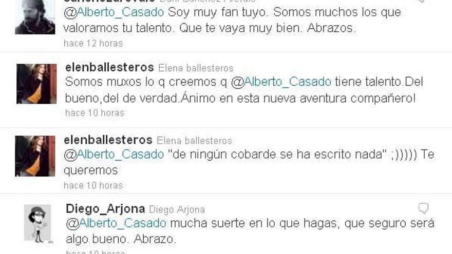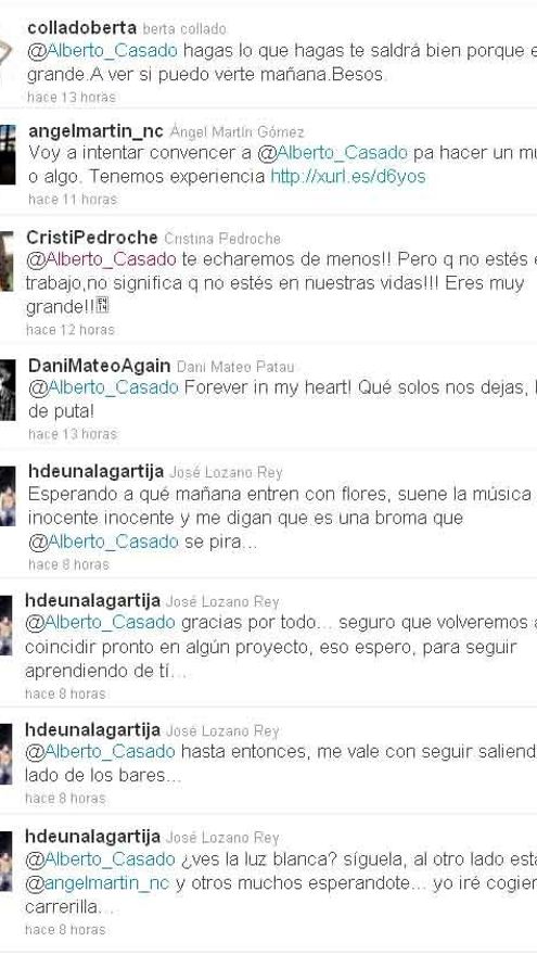La práctica totalidad de sus compañeros han querido tener unas palabras de agradecimiento y de recuerdo al trabajo de Alberto Casado, por lo que han mandado mensajes a través de Twitter. Así lo han hecho Berta Collado, Ángel Martín, Cristina Pedroche, Dani Mateo y Jose (hdeunalagartija).