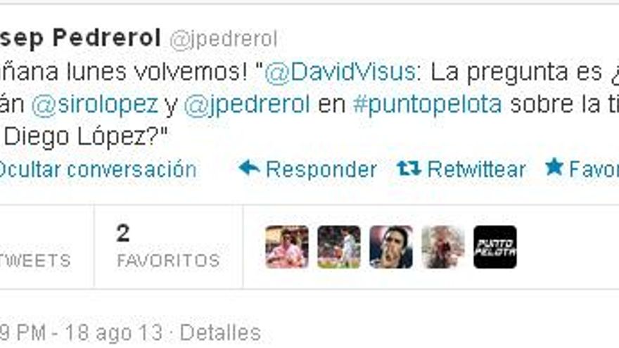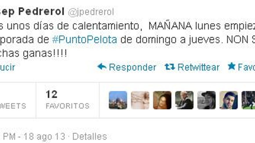 Pocos minutos después, a las 21:48 horas, ampliaba esa información con otro tuit: “Tras unos días de calentamiento, mañana lunes empieza la temporada de Punto Pelota de domingo a jueves. Non Stop. ¡Muchas ganas!”.