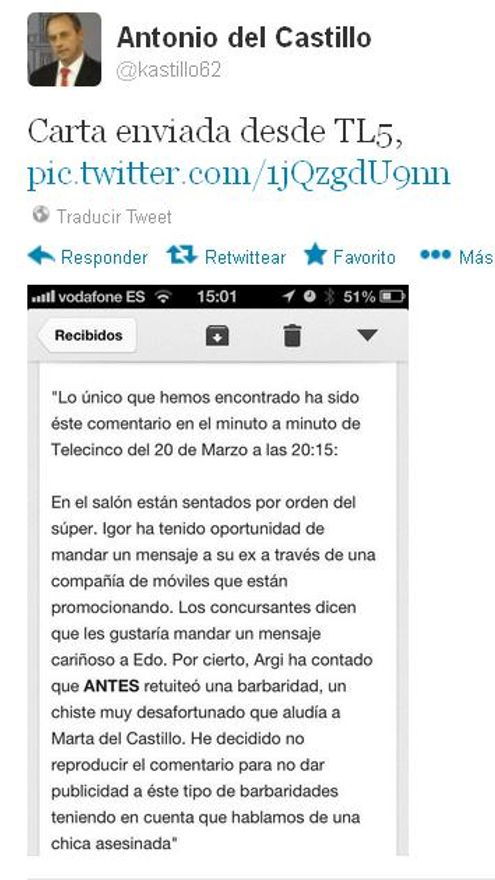 “Lo único que hemos encontrado ha sido este comentario en el minuto a minuto del 20 de marzo a las 20:15h [...] Argi ha contado que antes retuiteó una barbaridad, un chiste muy desafortunado que aludía a Marta del Castillo. He decidido no reproducir el comentario para no dar publicidad a este tipo de barbaridades teniendo en cuenta que hablamos de una chica asesinada”