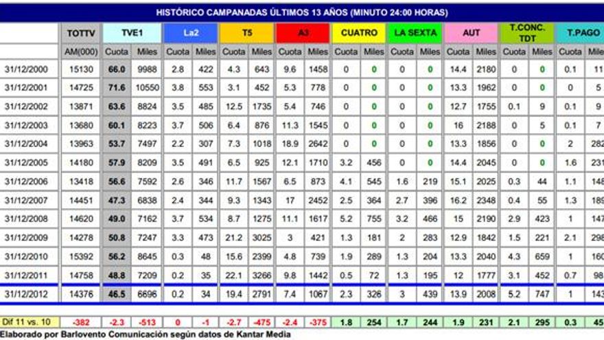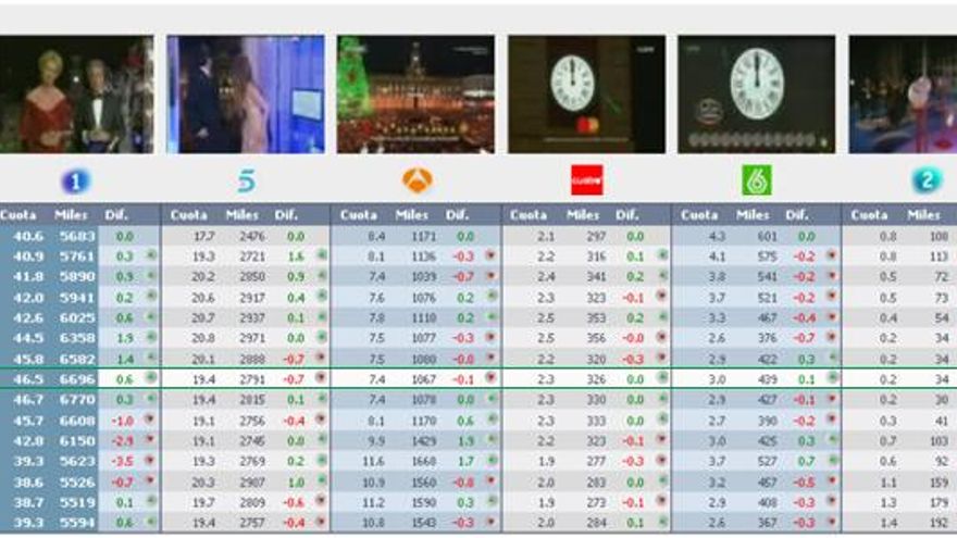 Este dato empeora 513.000 espectadores y 2.3 puntos de cuota al del año pasado en la cadena, que obtuvo un 48.8% de share y 7.2 millones de seguidores con el minuto de las uvas en las Campanadas 2011-2012.