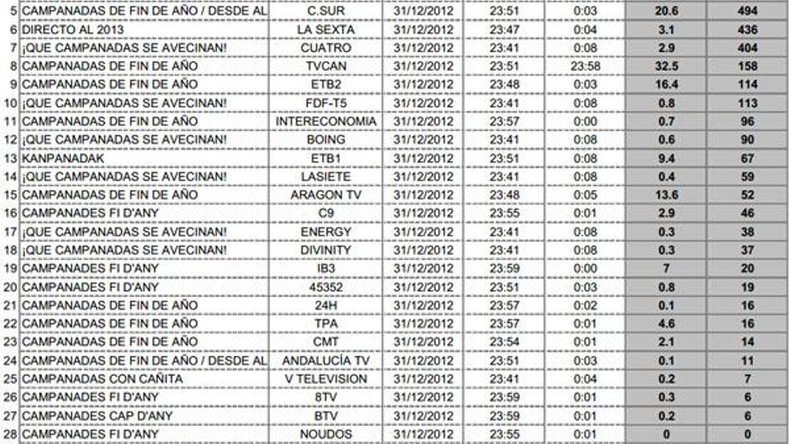Según se extrae del análisis de las audiencias de las Campanadas elaborado por la Consultora Barlovento Comunicación, la suma de la audiencia total en todas las cadenas que emitieron las uvas fue de 13.593.000 espectadores y alrederor del 94.5% de cuota de pantalla.