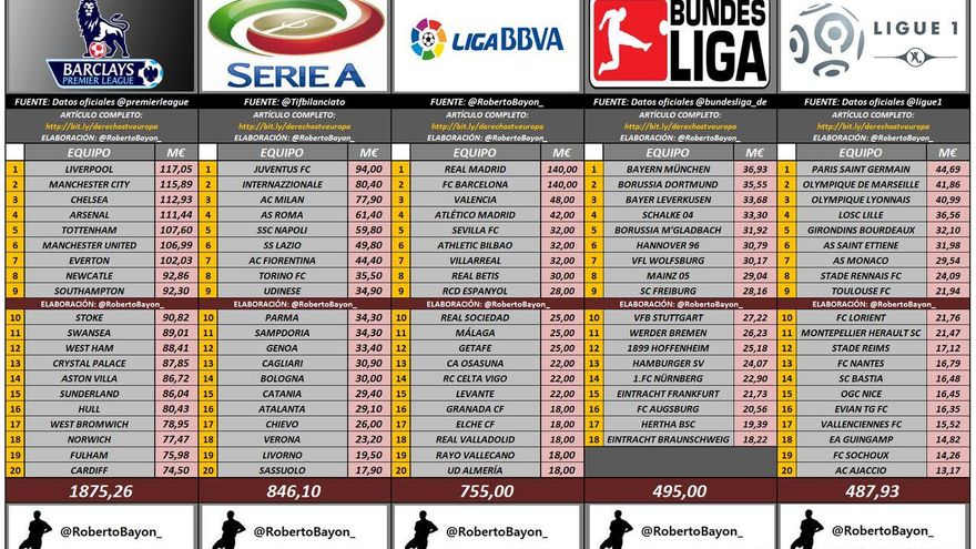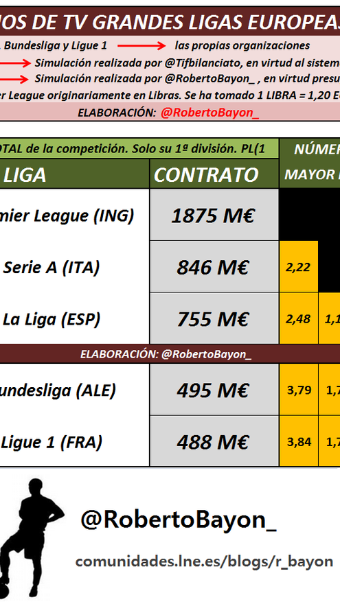 En España, la LFP vende sus derechos por un montante en torno a los 1.000 millones de euros. Además, y es lo que centra las críticas del resto de equipos, Real Madrid y Barcelona se llevan una grandísima parte de este “pastel”.