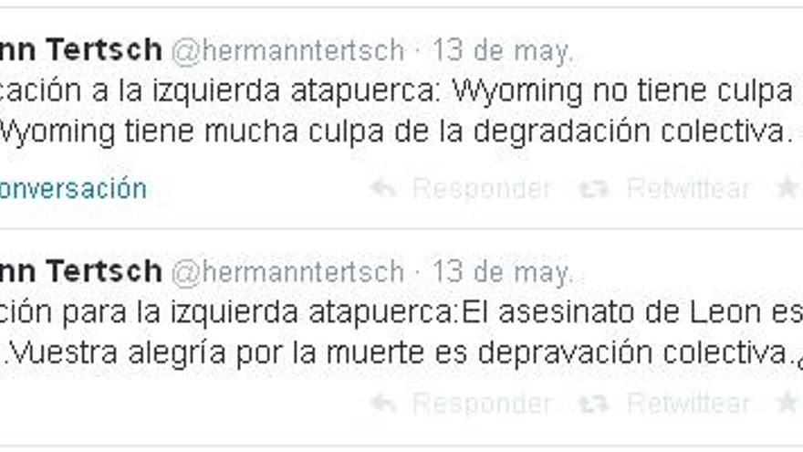 El último periodista del que habló el programa fue Hermann Tertsch. Tras haber llamado “gentuza” a todos los miembros de El Intermedio ante el micrófono de Gonzo, el periodista dijo en Twitter que “Wyoming no tiene culpa de la muerte de León. Wyoming tiene mucha culpa de la degradación colectiva”.