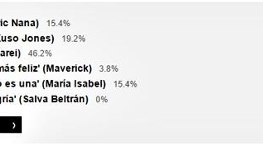 Según este primer sondeo sobre los avances presentados, Barei se coloca de momento en cabeza, tanto en los rankings de nuestro portal como de 20minutos. En segundo lugar, encontramos a Xuso Jones, mientras que Electric Nana se postula como la tercera mejor recibida. María Isabel estaría cerca de esta última en estas encuestas. Las propuestas de Maverick y Salva Beltrán son las que, por ahora, menos han llamado la atención de los oyentes.