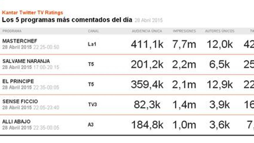Las tres grandes competidoras de las noches de los martes consiguen colarse entre lo más comentado de las redes sociales. En primer lugar, 'Masterchef' obtiene 42.200 tuits y casi 8 millones de impresiones. En el tercer puesto del ranking se sitúa 'El Príncipe' con casi 30.000 comentarios en la red social y 'Allí abajo' consigue un millón de impresiones y 7.400 tuits.