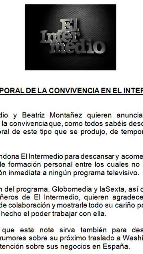 En el texto se asegura que Montañez abandona El Intermedio para “descansar y acometer nuevos proyectos de formación personal”, pero descarta su “incorporación inmediata a nungún programa temevisivo”.