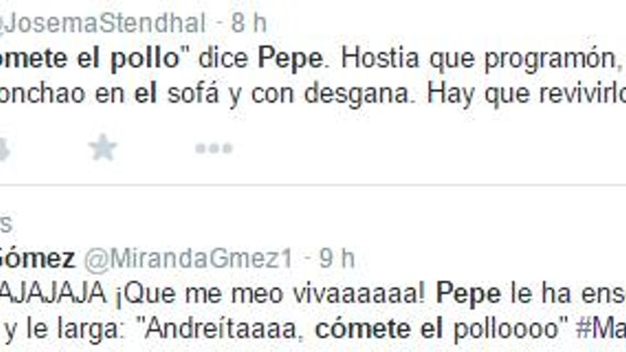 Aunque el fenómeno de la noche fue el #leóncomegamba que propició la expulsión de Alberto pero enamoró a la red, también hubo otro momento en 'MasterChef' que causó revuelo entre los espectadores. Tras la presentación de los platos de cada aspirante, y la degustación del jurado, Pepe Rodríguez quedó descontento con el plato de Andrea. La aspirante no pensó bien la elaboración y calculó mal los tiempos de cocción. El resultado fue un pollo crudo que el juez le obligó a comerse: “Andreita cómete el pollo”, le dijo haciendo alusión a la famosísima frase de Belén Esteban a su hija.