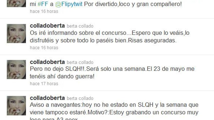Aunque la reportera de Sé lo que hicisteis se haya comprometido con las productoras y Antena 3 para participar en las ocho entregas previstas por ahora del concurso, este reto profesional no supondrá su marcha del programa de sobremesas de laSexta, tal y como ha explicado la propia Berta Collado en su cuenta personal de Twitter y ha confirmado este portal. “Estoy grabando un concurso muy loco para Antena 3 pero el 23 de mayo me tenéis de vuelta, dando guerra”