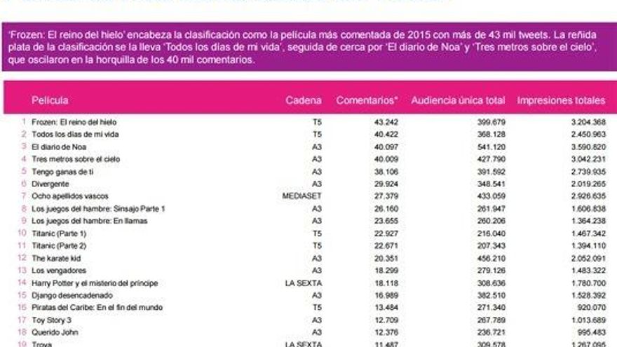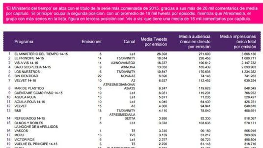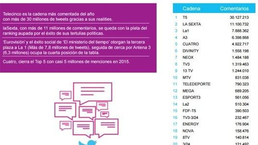 La televisión y Twitter reivindican su buena relación con excelentes datos de audiencia social, alcanzando en 2015, un total de 83.435.206 tweets relacionados con programas de televisión en España, según el último informe de Kantar Media.