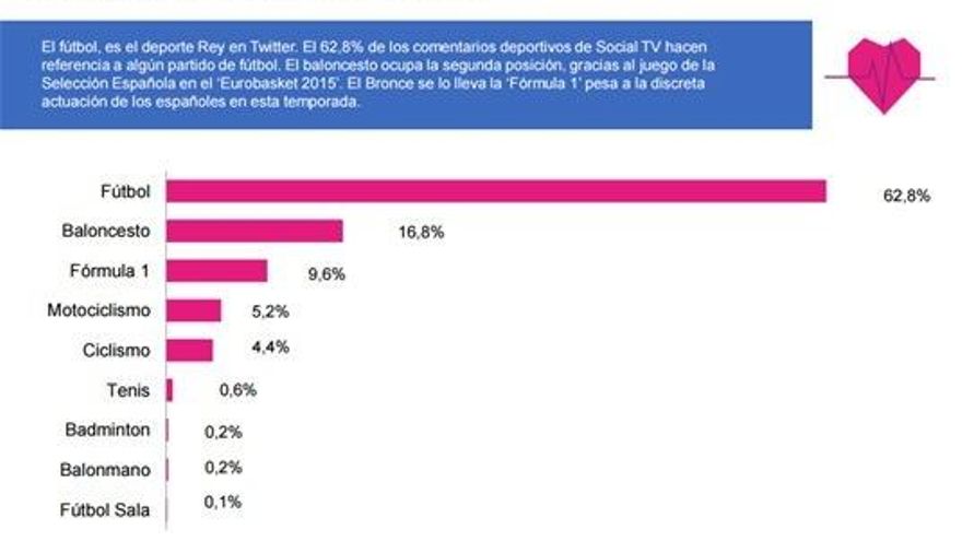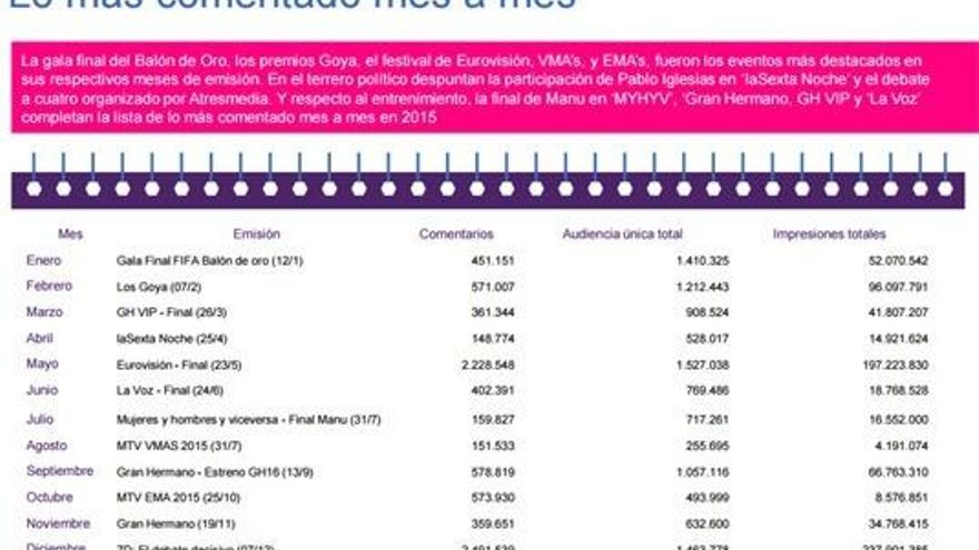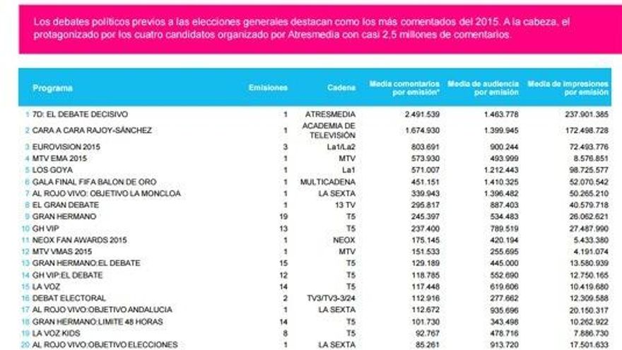 Más de 2,5 millones de autores únicos comentaron alguna de las más de 92 mil emisiones monitorizadas por Instar Social, en 2015, generando más de 11 mil millones de impresiones. Un 84%, más de 70 millones de comentarios, hicieron referencia a alguna de las miles de emisiones monitorizadas en Instar Social durante 2015. El 16% restante, más de13 millones de tweets, giraron en torno a alguna retransmisión deportiva.