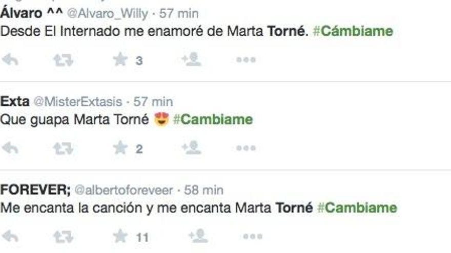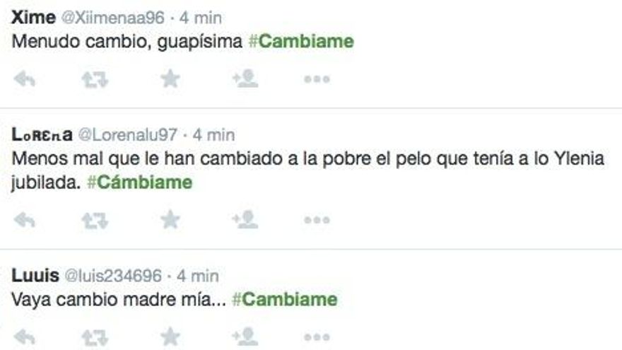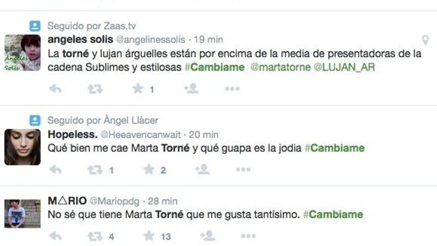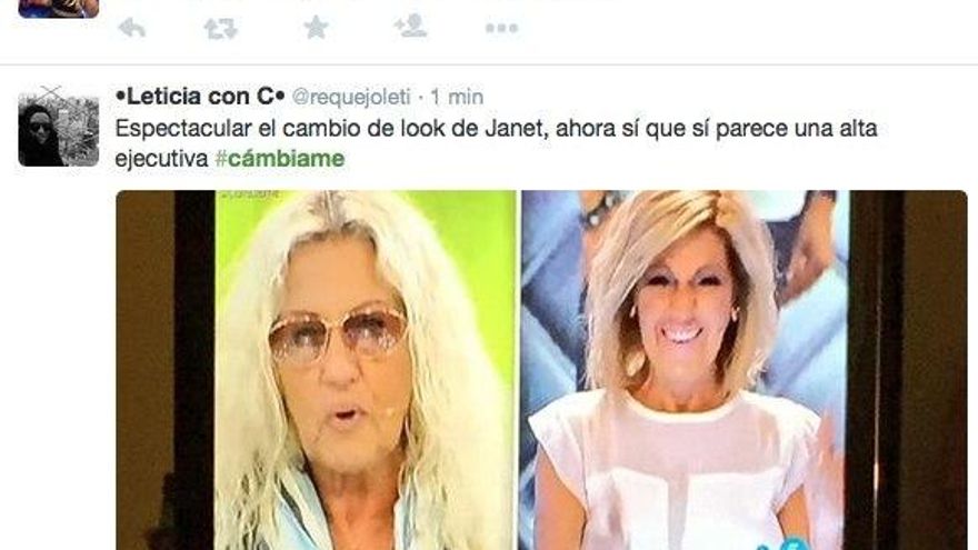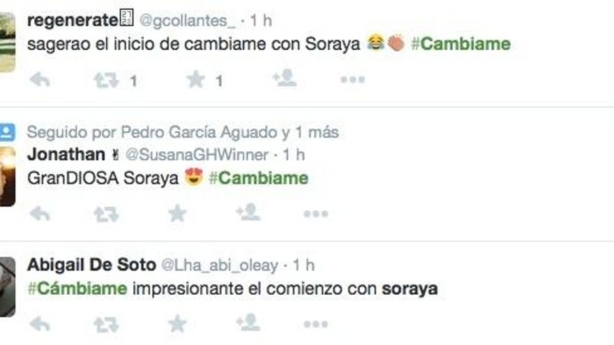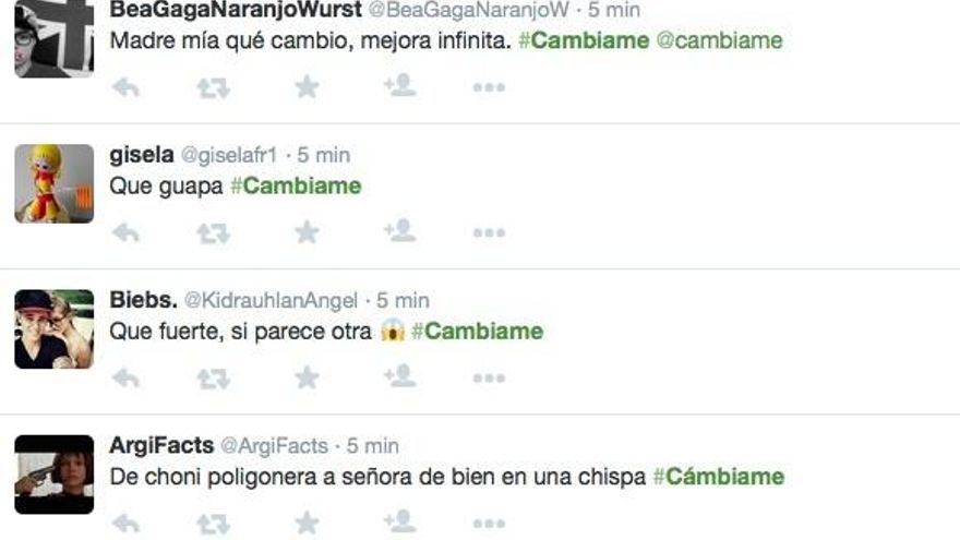El primer programa de 'Cámbiame' ha generado un aluvión de comentarios en Twitter, convirtiendo el hashtag del primer programa #Cámbiame en trending topic. Opiniones sobre el primer “espectacular” cambio de look de una mujer de 62 años, sobre los estilistas, la canción de Soraya en la intro del programa y sobre Marta Torné.