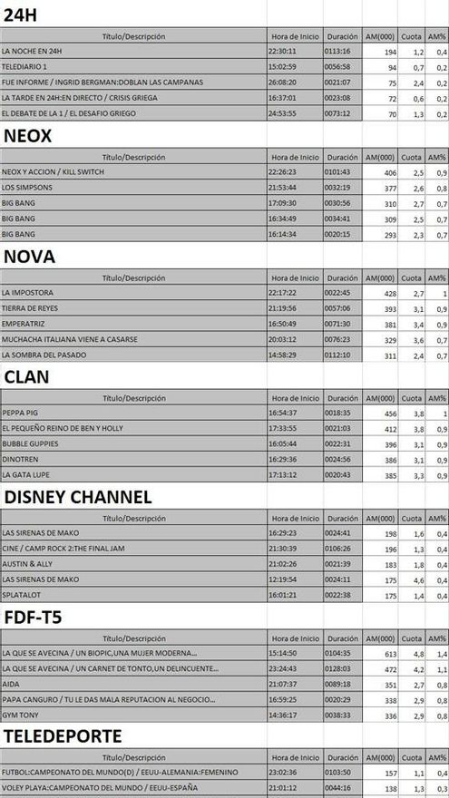 Audiencias TDT miércoles 01/07/15