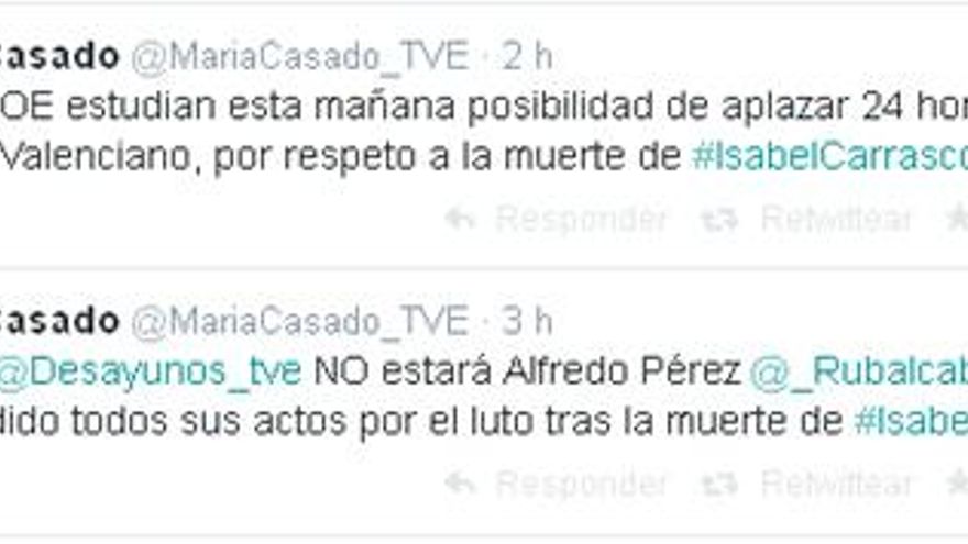 La presentadora de 'Los Desayunos de TVE' había explicado que “PP y PSOE estudian esta mañana posibilidad de aplazar 24 horas el debate Cañete-Valenciano, por respeto a la muerte de Isabel Carrasco”. Además, también había informado de que Rubalcaba no asistiría hoy finalmente a su programa por la misma razón.
