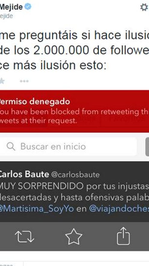 Es el caso de Carlos Baute. El artista tacha de “injustas, desacertadas y hasta ofensivas” sus palabras en el espacio de Cuatro. El propio Mejide se hizo eco de estas declaraciones en Twitter, además de hacer referencia a que ha sido bloqueado por parte del artista.