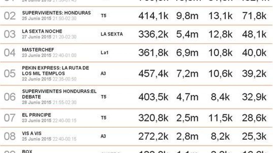 Por su parte, 'Supervivientes' sube un escalón y adelanta a 'La Sexta Noche', mientras 'Pekín Express' acorta distancias con 'Masterchef'.