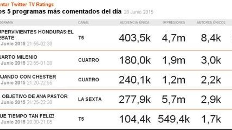 'Supervivientes: El Debate' se mantiene a la cabeza de la audiencia social de los domingos con cerca de 33.000 tuits, superando así los 27.500 de la semana anterior. En el caso de 'Cuarto Milenio', sucede lo contrario. Aunque mantiene su segunda posición, baja el número de tuits a 8.800.