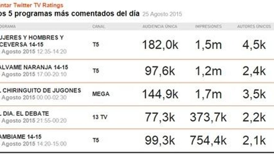 Por su parte, pese a ser la semifinal de 'Cocineros al volante', el programa de La 1 abandona el top 5 de la audiencia social y, en su lugar, entra 'Al Día, el debate', de 13TV con 5.600 tuits.
