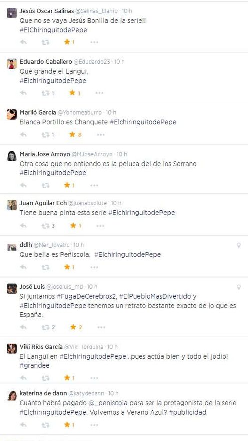 Para los usuarios de Twitter, la ficción protagonizada por Santi Millán y Jesús Bonilla destaca precisamente por su elenco. Tanto sus dos protagonistas como sus secundarios reciben elogios: “¡Qué grande el Langui!”, “¡Que no se vaya Jesús Bonilla de la serie!”. También son muy aclamadas sus localizaciones: “Es ver Peñíscola y sigues viéndola”, “qué bella es Peñíscola”.